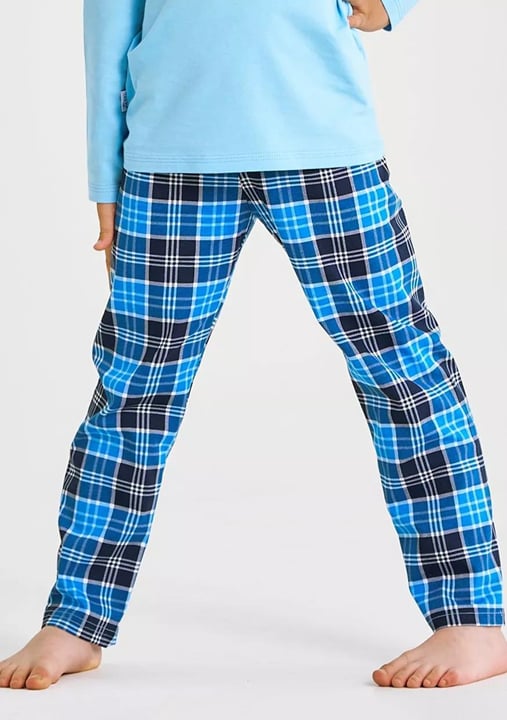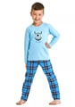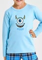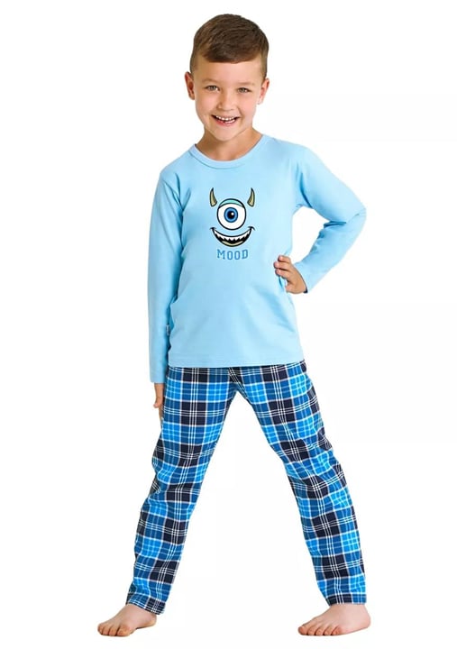 Chlapecké pyžamo Joel 3499/3500/51 značky TARO přináší radost a pohodlí do každého večera. Horní díl v jemné modré barvě zdobí hravý potisk s veselým monstrem a nápisem "MOOD", který vykouzlí úsměv na tváři každého malého dobrodruha. Příjemný materiál zaručuje komfort během spánku i domácího lenošení, zatímco dlouhé kalhoty s moderním kostkovaným vzorem v odstínech modré dodávají celému setu stylový vzhled. Díky volnému střihu se děti mohou svobodně pohybovat, což ocení při hrách i odpočinku.