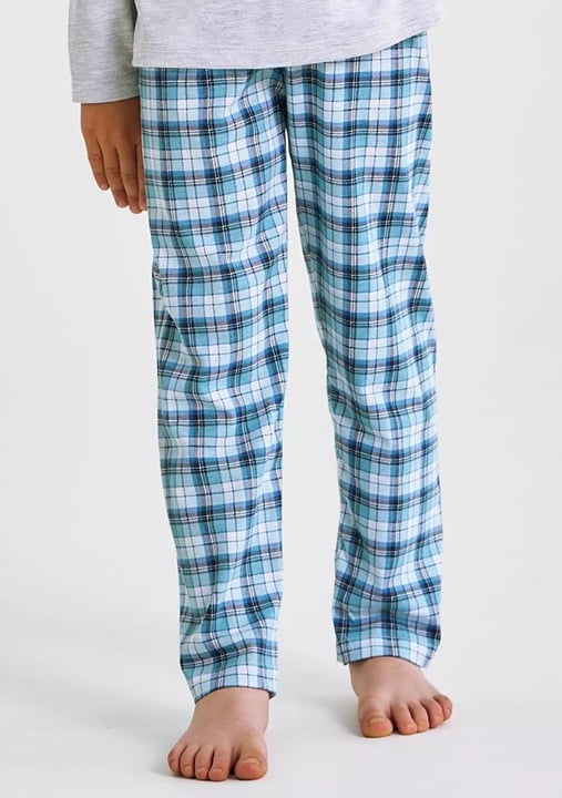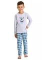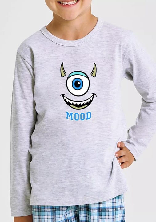 Chlapecké pyžamo Joel 3499/3500/52 značky TARO představuje spojení hravého designu a pohodlí, které si děti okamžitě oblíbí. Vrchní díl v jemné šedé barvě zdobí originální potisk monstra s nápisem „MOOD“ v modré barvě, což dodává pyžamu osobitý charakter. Dlouhé rukávy zajišťují příjemné teplo během chladnějších nocí, zatímco kalhoty s elastickým pasem přinášejí maximální volnost pohybu i při hrách před spaním. Kostkovaný vzor ve svěžích odstínech modré a zelené vytváří atraktivní kontrast k jednoduchému vršku.