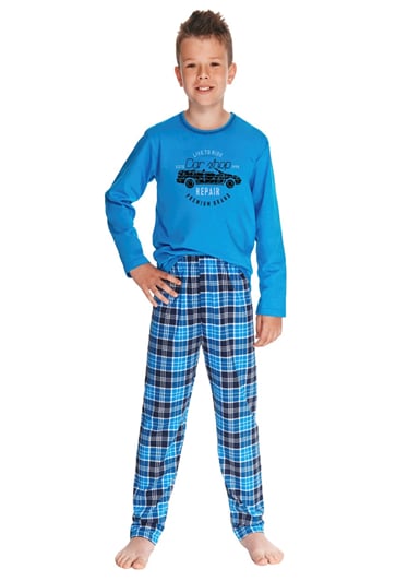 Chlapecké pyžamo Mario 2650/2651/21 TARO je chlapecké pyžamo Mario s obrázkem, dlouhým rukávem a dlouhými vzorovanými kalhotami. Tričko je s obrázkem auta a nápisem ´Car shop REPAIR´. Vzorované kalhoty jsou šité bez kapes a mají volnou gumu v pase. Pyžamo je možné používat i jako běžné oblečení na doma.
