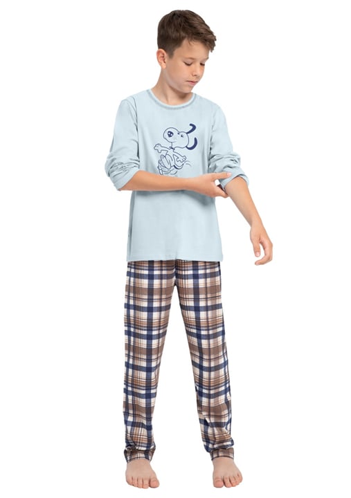 Chlapecké pyžamo s dlouhým rukávem a dlouhými kalhotami Parker 3089 Taro. Jednobarevné tričko je s obrázkem pejska a nápisem ´Explore the day´. Vzorované kalhoty jsou šité bez kapes a mají volnou gumu v pase. Pyžamo je ušité z kvalitní měkké bavlny, která poskytuje maximální komfort při nošení.