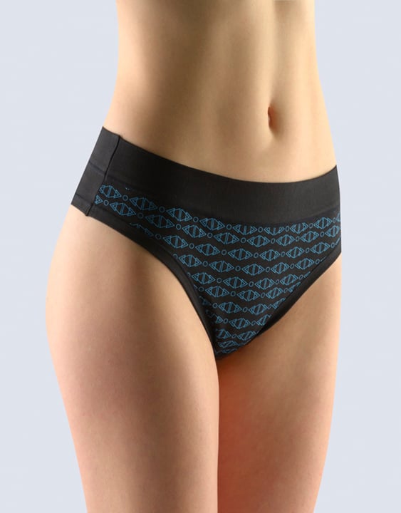 GINA 14144P jsou dámská, šitá, boková tanga francouzského střihu se širokým bokem.Pasový kraj je začištěný širším lemem ze stejného materiálu. Nohavičky jsou začištěné úzkým lemem ze stejného materiálu. Přední díl je potištěný. Zadní díl a lemy jsou jednobarevné.
