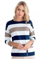 Dámská halenka 1068/14 značky HAJDAN představuje elegantní spojení pohodlí a stylu, které oceníte v každodenním shonu i při výjimečných příležitostech. Jemné horizontální proužky v námořnické modré, béžové a bílé vytvářejí vyvážený vzhled, který působí svěže a zároveň decentně. Tříčtvrteční rukávy poskytují volnost pohybu i vzdušnost, zatímco kulatý výstřih podtrhuje ženskou siluetu bez zbytečné okázalosti. Halenka je ušitá z kvalitní viskózy s příměsí polyesteru a lycry – materiál je měkký na dotek, prodyšný a drží tvar po celý den.
