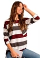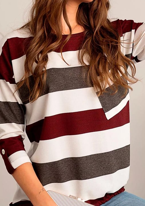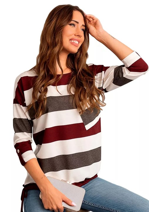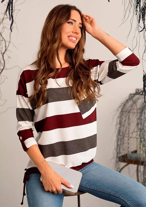 Dámská halenka 1068/31 značky HAJDAN představuje elegantní volbu pro ženy, které hledají spojení stylu a pohodlí. Výrazný pruhovaný vzor v odstínech vínové, bílé a tmavě šedé dodává modelu osobitý charakter. Díky 3/4 rukávům s možností ohrnutí pomocí knoflíku získáte větší variabilitu při nošení i během proměnlivých dnů. Kulatý výstřih podtrhuje jemnost střihu, zatímco diagonální kapsa na levé straně přináší originální detail.