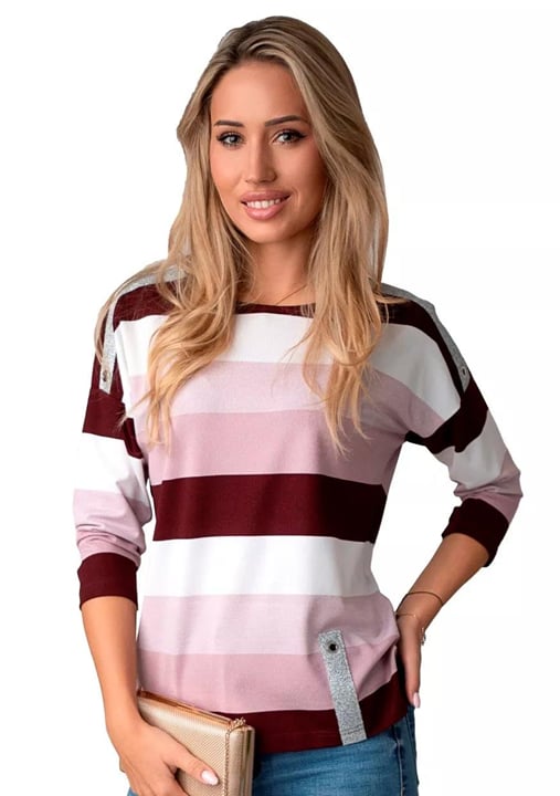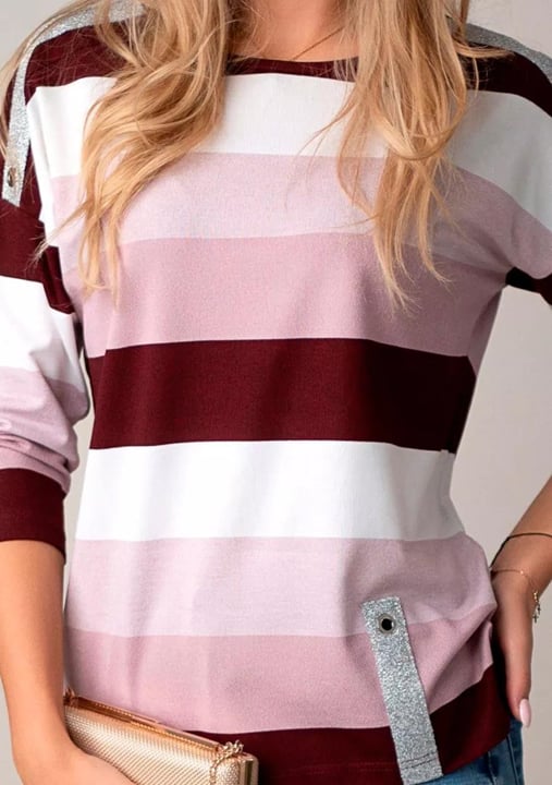 Dámská halenka 1068/34 značky HAJDAN přináší elegantní a uvolněný styl, který oceníte každý den. Pohodlný střih s tříčtvrtečními rukávy jemně kopíruje postavu a zároveň nabízí dostatek volnosti pro maximální komfort. Výrazné vodorovné pruhy v odstínech růžové, vínové a krémové vytvářejí originální vzhled, který zaujme na první pohled. Kulatý výstřih působí žensky a je ideální pro vrstvení i samostatné nošení. Měkký materiál s vysokým podílem viskózy zajišťuje příjemný pocit po celý den – halenka je lehká, vzdušná a vhodná do práce i na volný čas.
