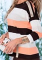 Dámská halenka 1068/41 značky HAJDAN je elegantní volbou pro ženy, které ocení pohodlí a styl v jednom. Výrazné horizontální pruhy v kombinaci bílé, světle meruňkové a tmavě hnědé barvy vytvářejí originální vzhled, který zaujme na první pohled. Měkký materiál s podílem viskózy poskytuje příjemný pocit na pokožce i při celodenním nošení. Halenka má uvolněný střih se zaobleným výstřihem a zdobnými kovovými detaily u ramen, což dodává outfitu moderní šmrnc.