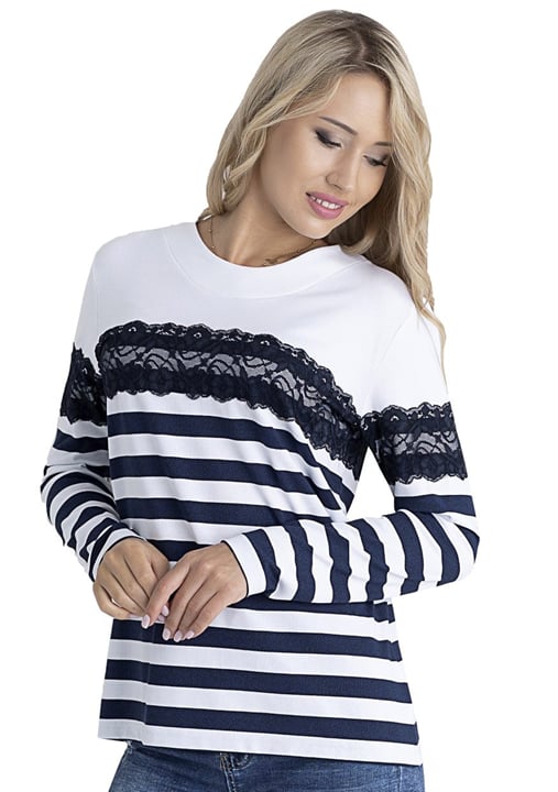 Dámská pruhovaná halenka s dlouhým rukávem je ozdobená krajkou na prsou a rukávech. Halenka je ušitá z příjemného viskózového úpletu, který nabízí dostatečný komfort při nošení během celého dne.