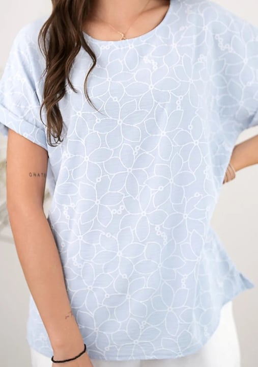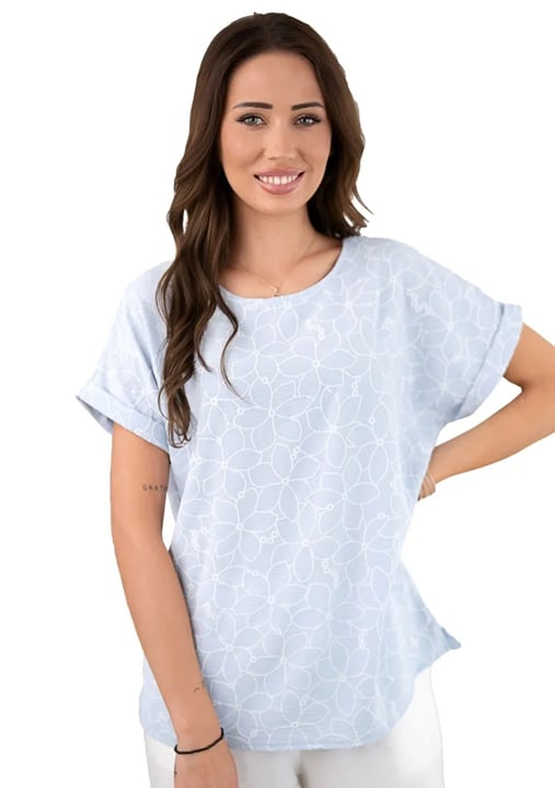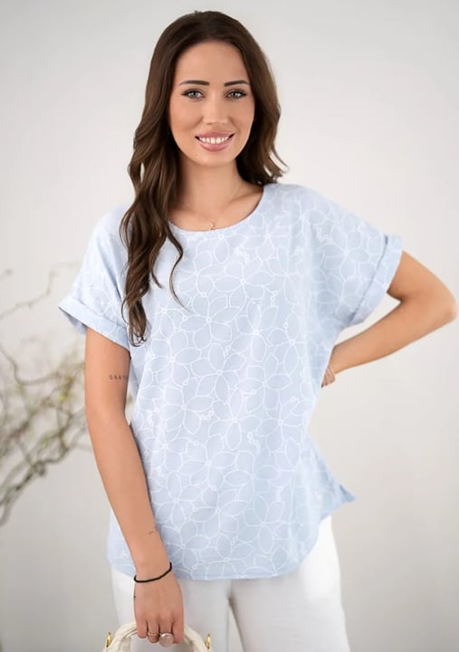 Dámská halenka 1231_06 značky HAJDAN představuje dokonalou volbu pro ženy, které hledají spojení elegance a pohodlí. Světlý modrý odstín s jemným vzorováním působí svěže a decentně, zatímco volný střih zajišťuje maximální komfort po celý den. Krátké rukávy s lehce ohrnutými lemy dodávají modelu uvolněný vzhled, který oceníte při každodenním nošení i během víkendových setkání. Kulatý výstřih lichotí postavě a umožňuje snadné kombinování s oblíbenými doplňky či šperky.