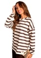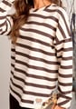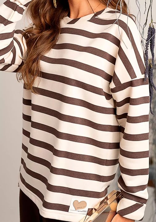 Dámská halenka 1239_01 značky HAJDAN přináší do Vašeho šatníku svěží kombinaci elegance a pohodlí. Její volnější střih s efektními širokými pruhy v krémové a hnědé barvě vytváří příjemný, uvolněný vzhled, který si zamilujete při každodenním nošení i víkendovém odpočinku. Kulatý výstřih s jemným žebrováním podtrhuje ležérní styl halenky, zatímco dlouhé rukávy bez manžet poskytují maximální komfort a volnost pohybu. Měkký materiál ze směsi bavlny s elastanem je lehký na dotek a zajišťuje celodenní pohodlí bez kompromisů.
