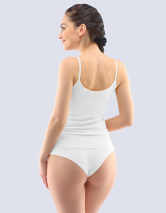 GINA 08016P je dámská, bezešvá košilka s úzkými ramínky. Dolní kraj je zapravený bezešvým způsobem. Průramky a průkrčník jsou začištěny lemovacími proužky, které přechází do ramínek. Košilka je jednobarevná. Je bez loga. Košilka je v prodloužené délce.
