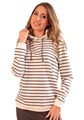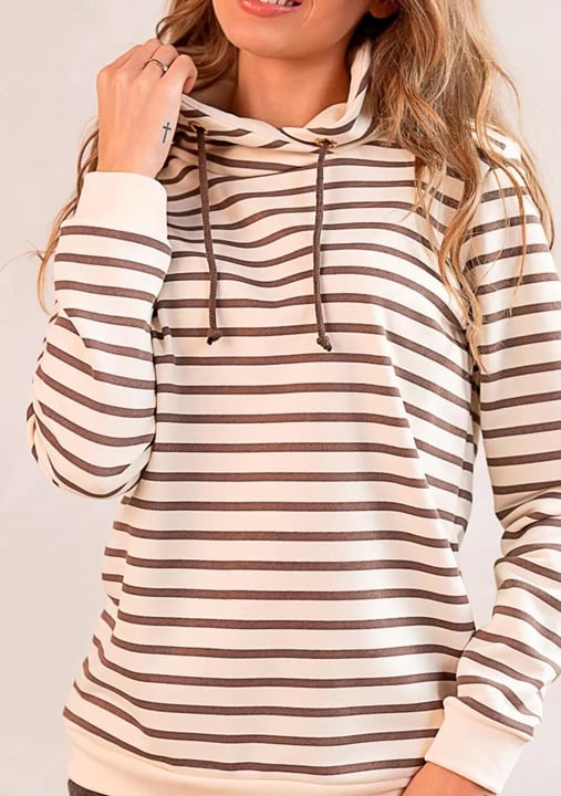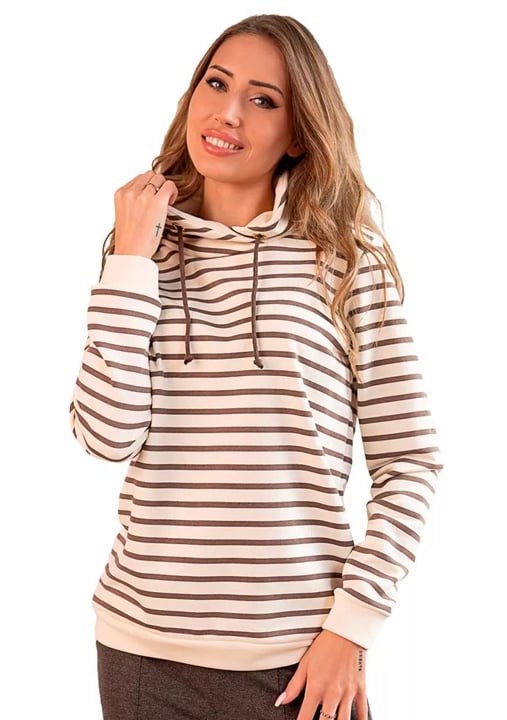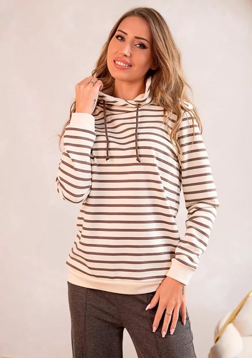 Dámská mikina 1244_01 značky HAJDAN přináší do Vašeho šatníku spojení elegance a pohodlí. Světlý krémový základ s jemnými hnědými pruhy vytváří výrazný, ale vkusný vzhled, který se snadno kombinuje s džínami i legínami. Měkký materiál z bavlny s příměsí elastanu je příjemný na dotek a poskytuje volnost pohybu po celý den. Praktická kapuce se stahovacími šňůrkami chrání před větrem i v chladnějším počasím, zatímco pružné manžety drží rukávy přesně tam, kde mají být.