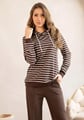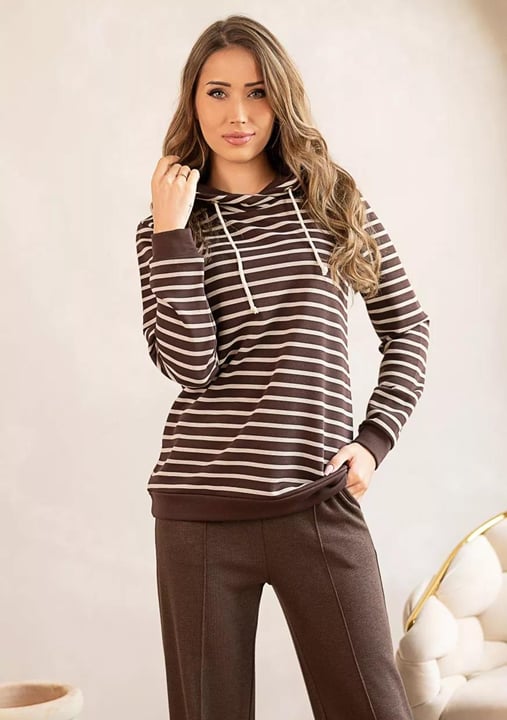 Dámská mikina 1244_02 značky HAJDAN přináší do Vašeho šatníku spojení elegance a pohodlí. Hnědý základ s jemnými béžovými pruhy vytváří výrazný, ale vkusný vzhled, který se snadno kombinuje s džínami i legínami. Měkký materiál z bavlny s příměsí elastanu je příjemný na dotek a poskytuje volnost pohybu po celý den. Praktická kapuce se stahovacími šňůrkami chrání před větrem i v chladnějším počasím, zatímco pružné manžety drží rukávy přesně tam, kde mají být.