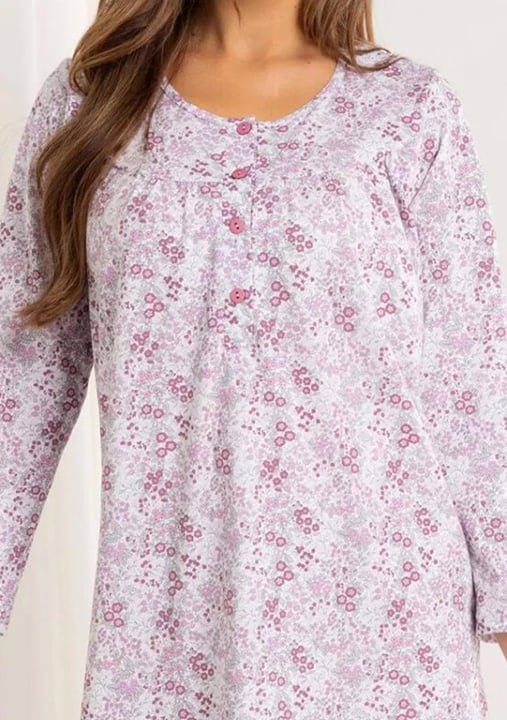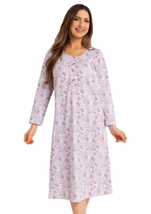 Dámská noční košile 017/51 značky REGINA přináší spojení elegance a pohodlí, které oceníte při každém večeru. Jemný květinový vzor na světlém podkladu vytváří příjemnou atmosféru pro klidné chvíle doma. Volnější střih a dlouhý rukáv zajišťují maximální komfort i během chladnějších nocí, zatímco kulatý výstřih s decentními knoflíky dodává modelu šmrnc i praktičnost. Díky použití 100% bavlny je materiál nejen hebký na dotek, ale také skvěle prodyšný a vhodný pro citlivou pokožku.