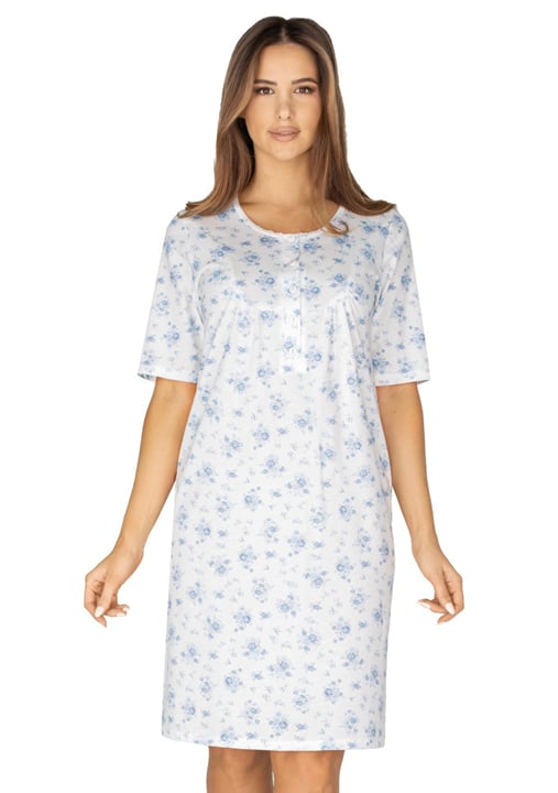 Dámská noční košile 083 REGINA je dámská bavlněná vzorovaná noční košile s krátkým rukávem. Vzorovaná noční košile má hluboký propínací výstřih na knoflíky. Je možné používat i jako volné triko na doma.