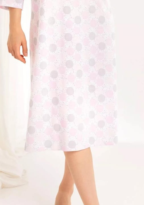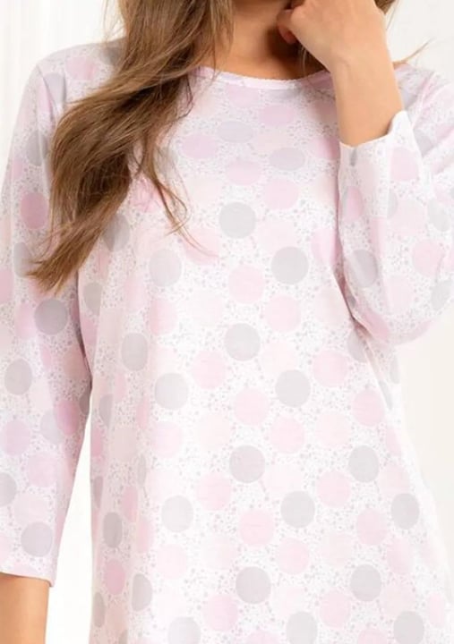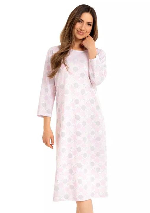 Dámská noční košile 161/51 značky REGINA představuje spojení elegance a pohodlí, které si zamilujete při každém večerním odpočinku. Její volný střih s délkou ke kolenům a dlouhými rukávy nabízí maximální komfort i volnost pohybu. Jemný pastelově růžový odstín v kombinaci s velkými šedými puntíky působí hravě, ale zároveň decentně. Kulatý výstřih podtrhuje jednoduchost designu a umožňuje snadné oblékání.