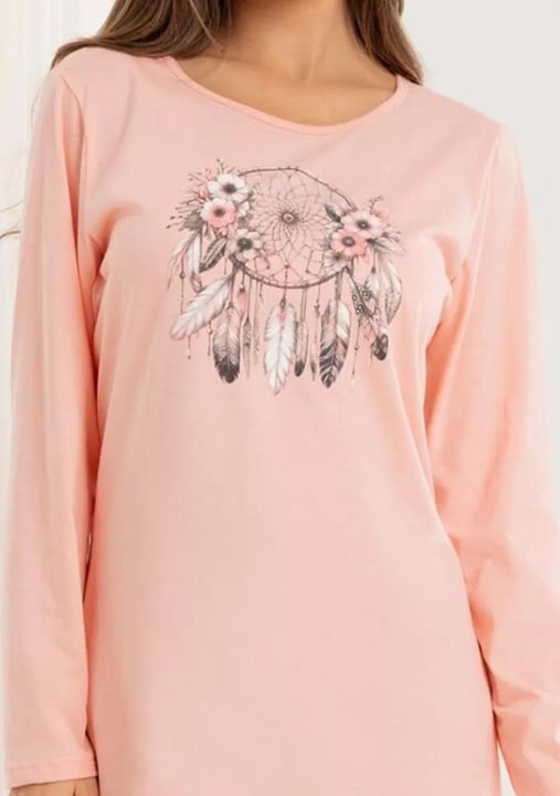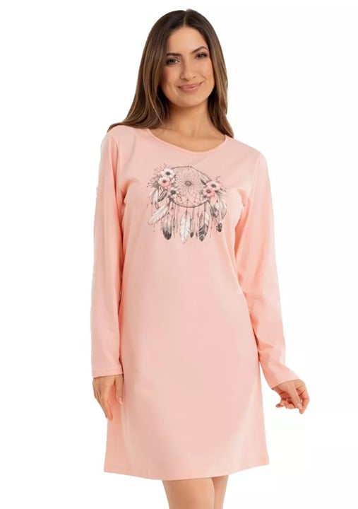 Dámská noční košile 162/53 značky REGINA představuje spojení pohodlí a elegantního stylu, který ocení každá žena. Jemný odstín působí svěže a dodává pocit lehkosti při každém dotyku s pokožkou. Volnější střih s dlouhými rukávy vytváří ideální podmínky pro ničím nerušený spánek i chvíle domácí pohody. Výrazným prvkem je originální grafický potisk na hrudi – motiv lapače snů s květinovými detaily přináší do Vašeho šatníku nádech kreativity.