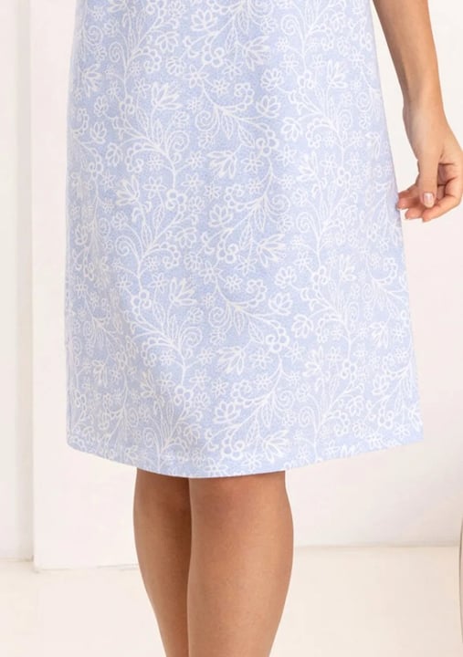 Dámská noční košile 169/62 značky REGINA přináší spojení pohodlí a ženské elegance, které oceníte při každém večeru i domácím lenošení. Lehký materiál z čisté bavlny jemně hladí pokožku a umožňuje volný pohyb. Krátké rukávy a kulatý výstřih podtrhují pocit lehkosti, zatímco výrazný květinový vzor v modrých tónech dodává noční košily noblesu. Tato košile je ideální volbou pro ženy, které hledají kvalitní domácí oblečení s důrazem na detail i komfort.