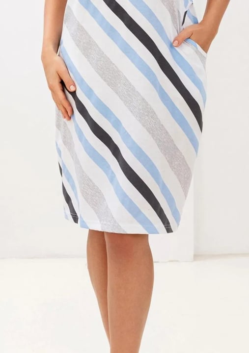 Dámská noční košile 175/61 značky REGINA přináší dokonalou kombinaci pohodlí a stylu pro každou ženu, která si přeje kvalitní spánek i elegantní vzhled. Díky volnému střihu a příjemné délce se budete cítit lehce po celou noc. Moderní diagonální proužky v odstínech modré, šedé a černé vytvářejí svěží dojem, který zaujme na první pohled. Krátké rukávy poskytují dostatek vzdušnosti během teplejších dnů, zatímco kulatý výstřih jemně zvýrazňuje dekolt bez ztráty komfortu. Materiál ze 100% bavlny zajišťuje maximální komfort při nošení.