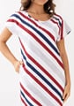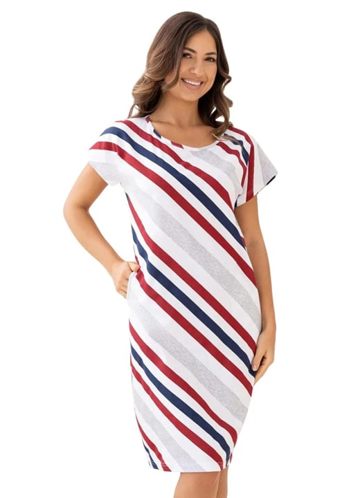 Dámská noční košile 175/62 značky REGINA představuje ideální volbu pro ženy, které hledají pohodlí a styl v jednom. Volný střih s krátkými rukávy zajišťuje maximální komfort během celého večera i noci. Měkký materiál ze 100% bavlny je příjemný na dotek a umožňuje pokožce dýchat, což oceníte zejména v teplejších měsících. Výrazné diagonální pruhy v kombinaci bílé, červené a tmavě modré barvy vytvářejí moderní vzhled, který osvěží Váš domácí šatník. Kulatý výstřih usnadňuje oblékání a dodává košili elegantní nádech.