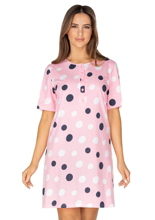 Dámská noční košile 416 REGINA je dámská bavlněná noční košile s krátkým rukávem. Noční košile je se vzorem puntíku a hlubokým propínacím výstřihem na knoflíky. Košily je možné používat i jako volné triko na doma.