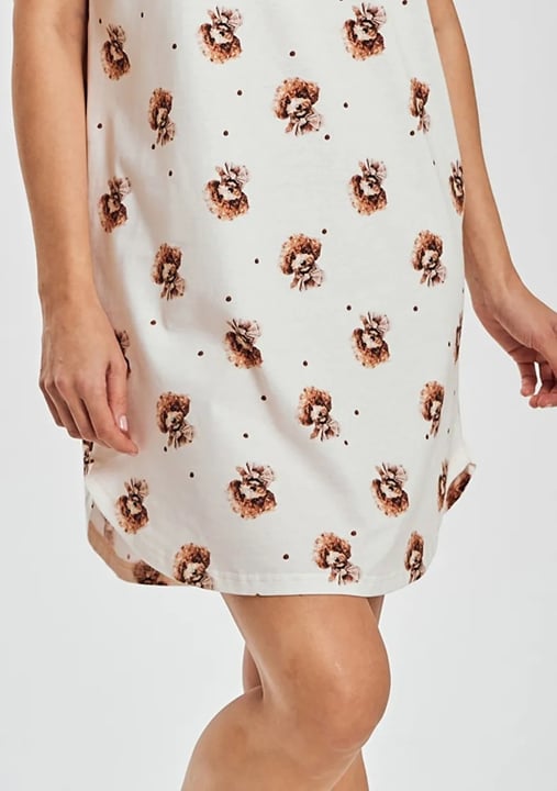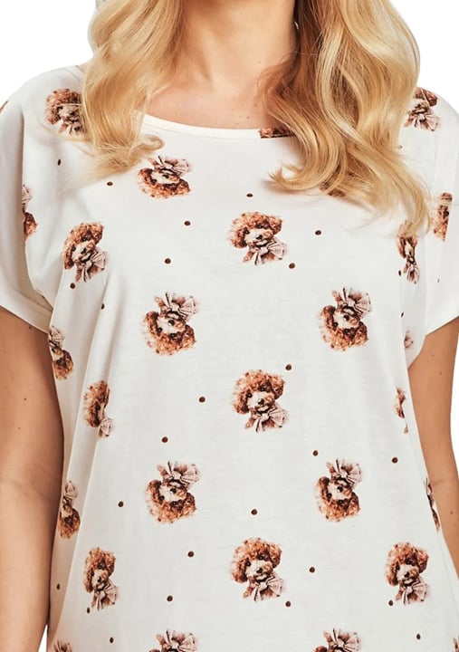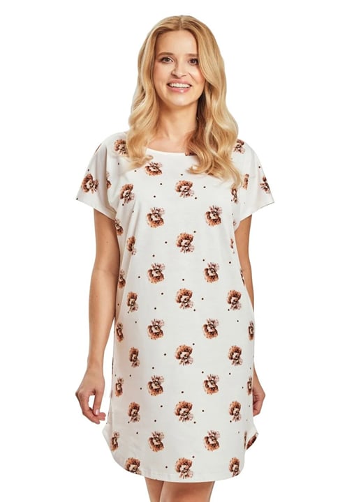 Dámská noční košile Coco 3517 značky TARO přináší radost do každého večera díky svému hravému designu a mimořádnému pohodlí. Lehký, vzdušný materiál zaručuje příjemný pocit na pokožce, zatímco volnější střih s krátkými rukávy a kulatým výstřihem nabízí maximální komfort při odpočinku i spánku. Originální potisk pejska v teplých odstínech hnědé a oranžové dodává této noční košili osobitý šarm, který si okamžitě oblíbíte. Díky délce nad kolena je ideální pro domácí pohodu během teplejších dnů nebo jako stylový doplněk Vašeho relaxačního šatníku.