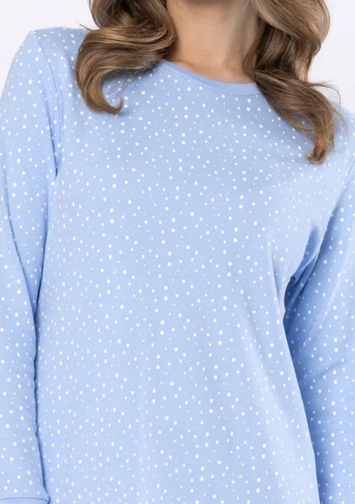 Dámská noční košile Kryspina 1659 značky LEVEZA je ztělesněním pohodlí a elegance pro každou ženu, která si přeje zažít opravdový pocit lehkosti během odpočinku. Světle modrý odstín s jemným potiskem bílých puntíků vytváří hravý, ale zároveň decentní vzhled. Díky volnému střihu a měkkému materiálu se budete cítit příjemně po celou noc i při domácím lenošení. Dlouhé rukávy zakončené mírně přiléhavou manžetou zahřejí v chladnějších večerech, zatímco kulatý výstřih podtrhuje jednoduchost a ženskost tohoto modelu.