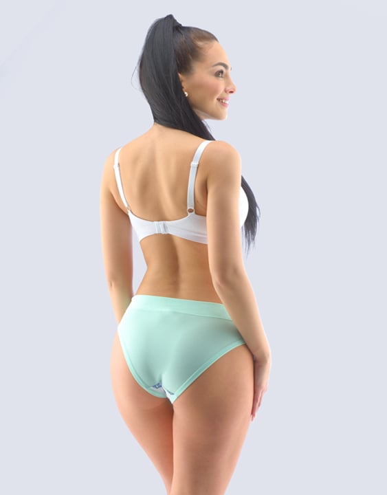 GINA 16164P jsou bokové kalhotky se širším bokem, bokovky se širším pasovým lemem, dámské šité prádlo. Pasový kraj je začištěný širším lemem ze stejného materiálu. Přední díl je potištěný. Zadní díl a lemy jsou jednobarevné.