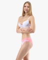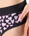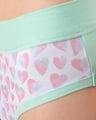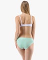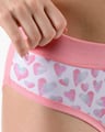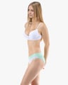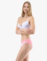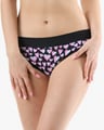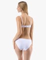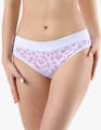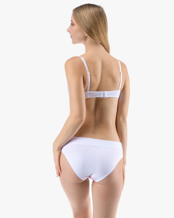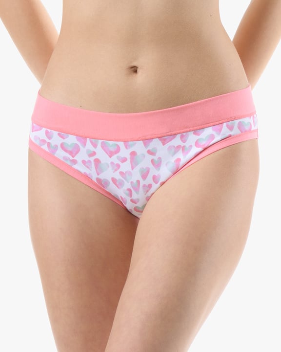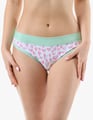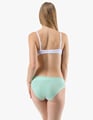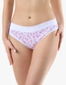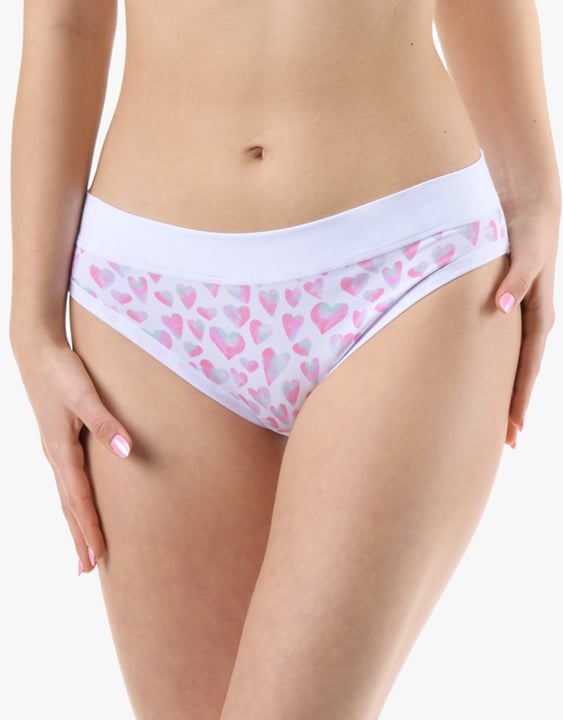 Dámské bokové kalhotky se širokým bokem GINA 16183P jsou dámské šité kalhotky se širším bokem a se širším pasovým lemem. Pasový kraj je začištěný širším lemem ze stejného materiálu. Nohavičky jsou začištěné úzkým lemem ze stejného materiálu. Přední díl bavlněných kalhotek je potištěný. Zadní díl a lemy jsou jednobarevné.
