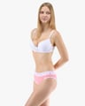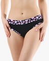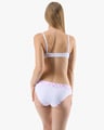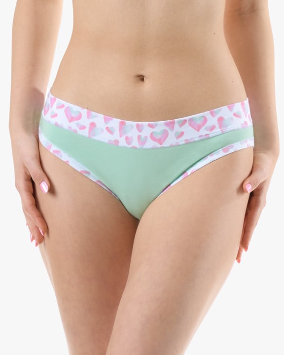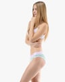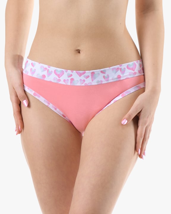 Dámské bokové kalhotky se širokým bokem GINA 16184P jsou bokové kalhotky se širším bokem a se širším pasovým lemem. Pasový kraj je začištěný širším lemem ze stejného materiálu. Nohavičky kalhotek jsou začištěné úzkým lemem ze stejného materiálu. Šité lemy v pase a v nohavičkách jsou potištěné. Bavlněné kalhotky mají přední i zadní díl jednobarevný.