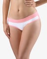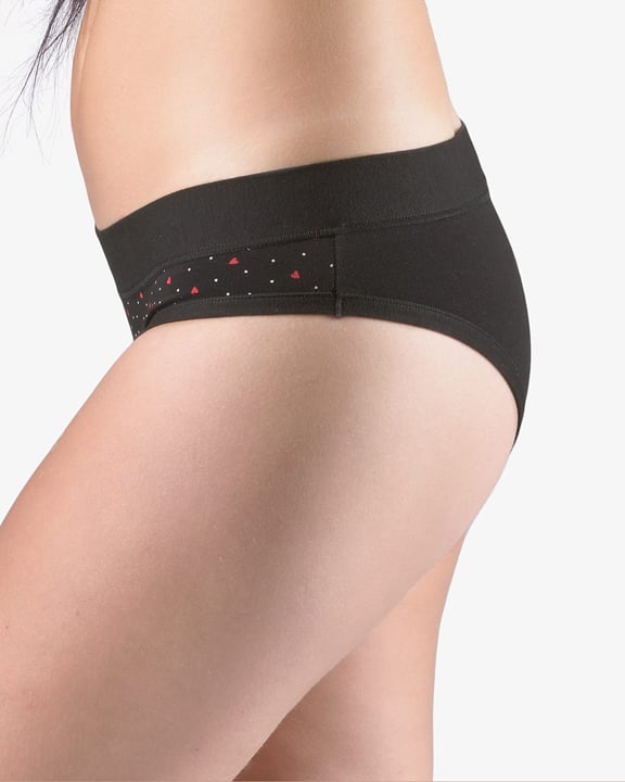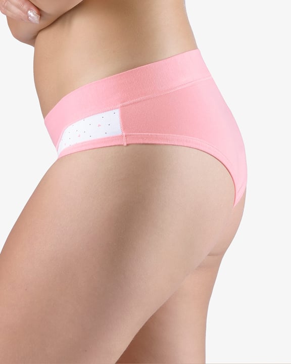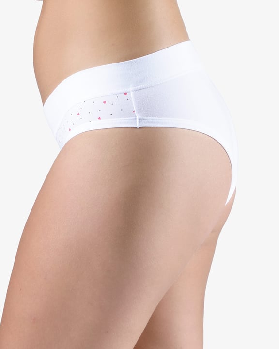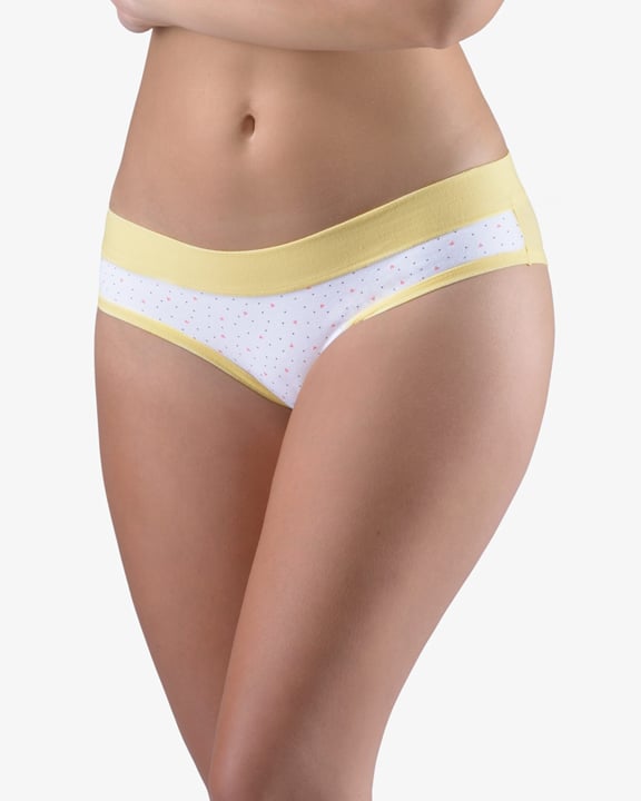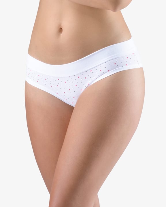 Dámské francouzské kalhotky GINA 14158P jsou bokové kalhotky francouzského střihu se širokým bokem a širším pasovým lemem, dámské šité prádlo. Pasový kraj je začištěný širším lemem ze stejného materiálu. Nohavičky jsou začištěné úzkým lemem ze stejného materiálu. Přední díl je potištěný. Zadní díl a lemy jsou jednobarevné.