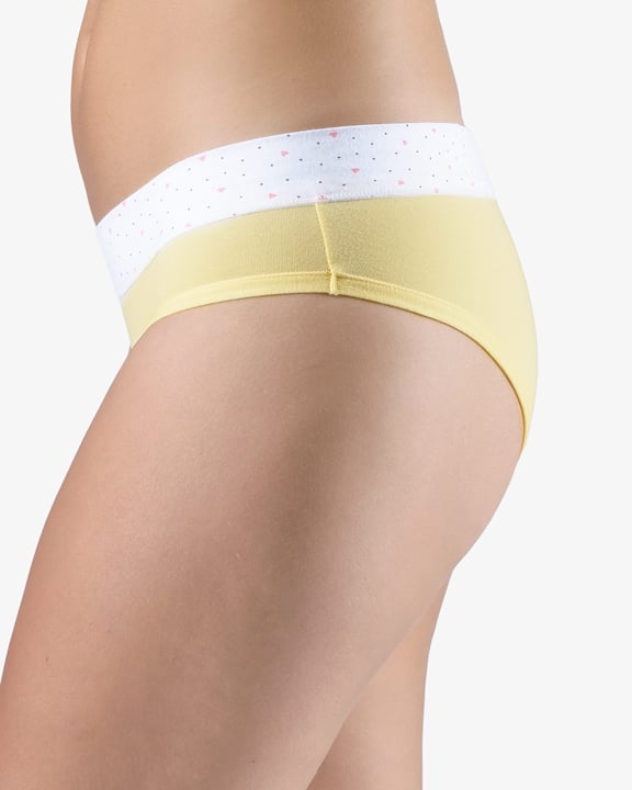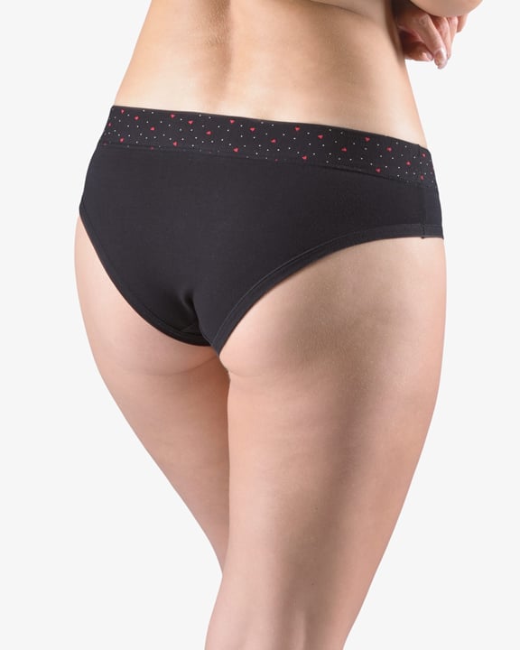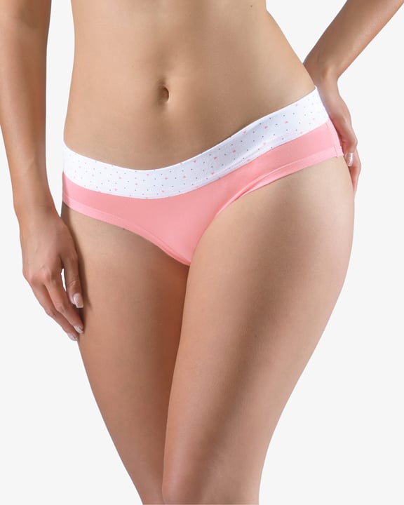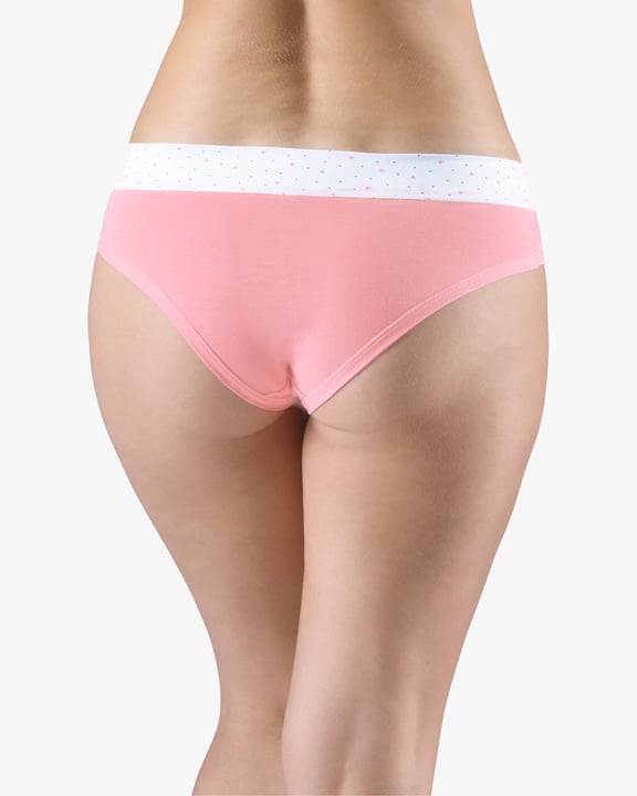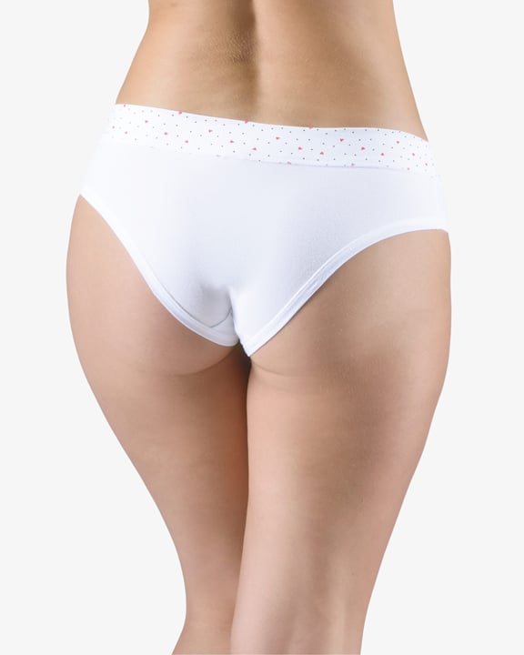 Dámské francouzské kalhotky GINA 14159P jsou bokové kalhotky francouzského střihu se širokým bokem a širším pasovým lemem, dámské šité prádlo. Pasový kraj je začištěný širším lemem ze stejného materiálu, zdobí ho potisk s drobnými srdíčky. Nohavičky jsou začištěné úzkým lemem ze stejného materiálu.
