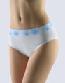 GINA 10228P jsou dámské, šité kalhotky klasického střihu se širším pasovým lemem. Pasový kraj je začištěný širším lemem ze stejného materiálu. Nohavičky jsou začištěné úzkým lemem ze stejného materiálu. Pasový lem je potištěný. Přední a zadní díl a lemy nohaviček jsou jednobarevné.