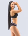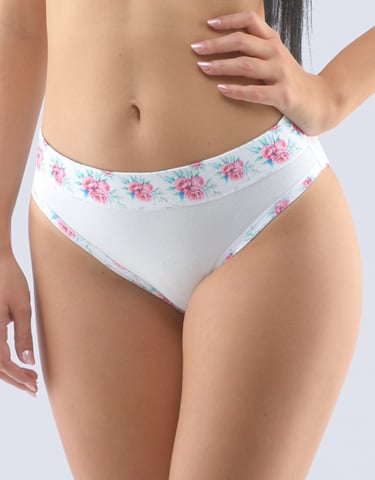 Dámské kalhotky s širokým bokem GINA 16157P jsou bokové kalhotky se širším bokem, bokovky, a se širším pasovým lemem, dámské šité prádlo. Pasový kraj je začištěný širším lemem ze stejného materiálu. Nohavičky jsou začištěné úzkým lemem ze stejného materiálu. Pasový lem a lemy nohaviček jsou potištěné. Přední a zadní díl jsou jednobarevné.