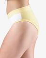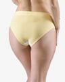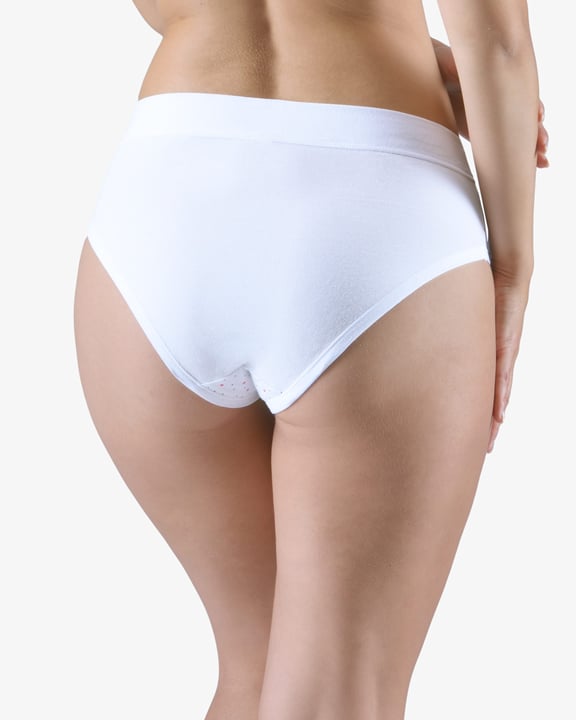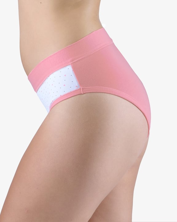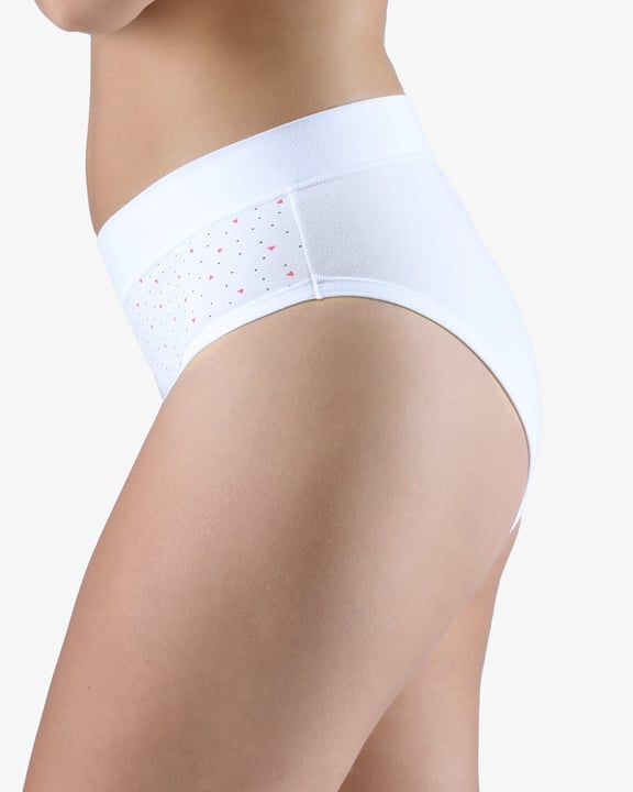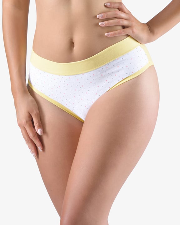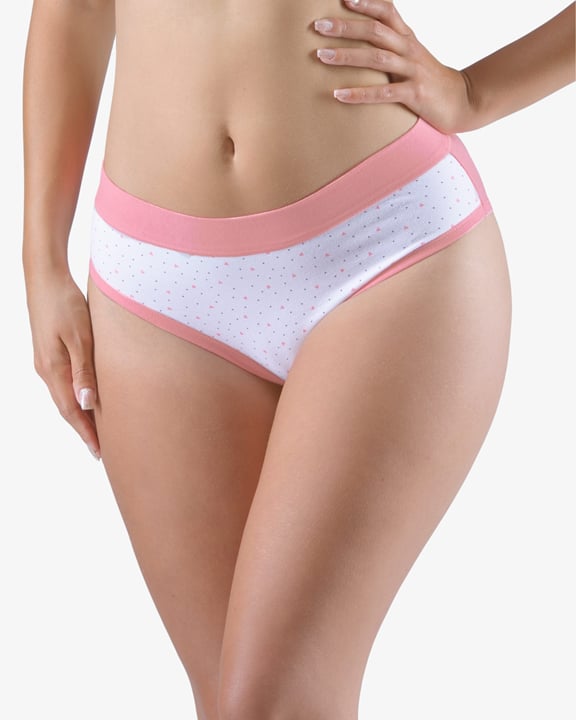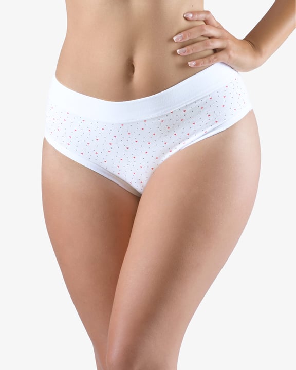 Dámské klasické kalhotky GINA 10275P jsou kalhotky klasického střihu se širším pasovým lemem. Pasový kraj je začištěný širším lemem ze stejného materiálu. Nohavičky jsou začištěné úzkým lemem ze stejného materiálu. Přední díl je potištěný. Zadní díl a lemy jsou jednobarevné.