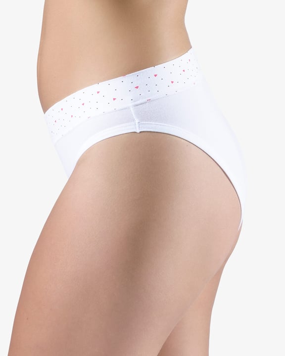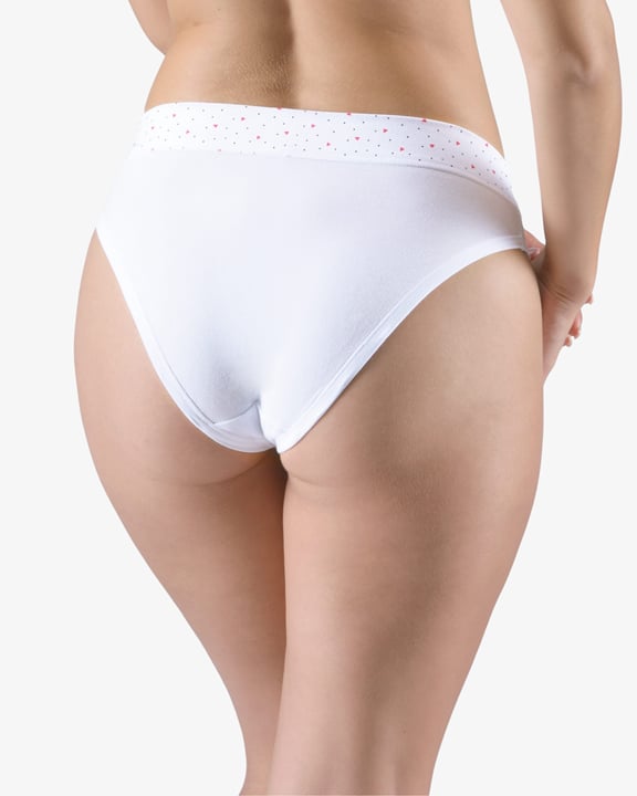 Dámské klasické kalhotky s úzkým bokem GINA 10280P jsou kalhotky klasického střihu s úzkým bokem a širším pasovým lemem, dámské šité prádlo. Pasový kraj je začištěný širším lemem ze stejného materiálu. Zdobí jej potisk s drobnými srdíčky. Nohavičky jsou začištěné úzkým lemem ze stejného materiálu.