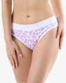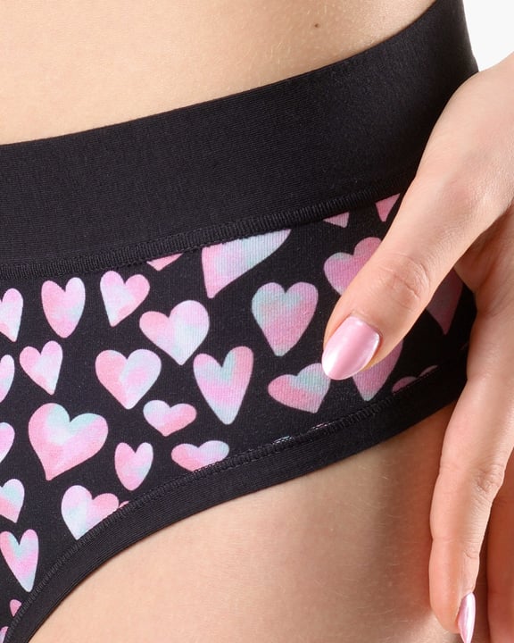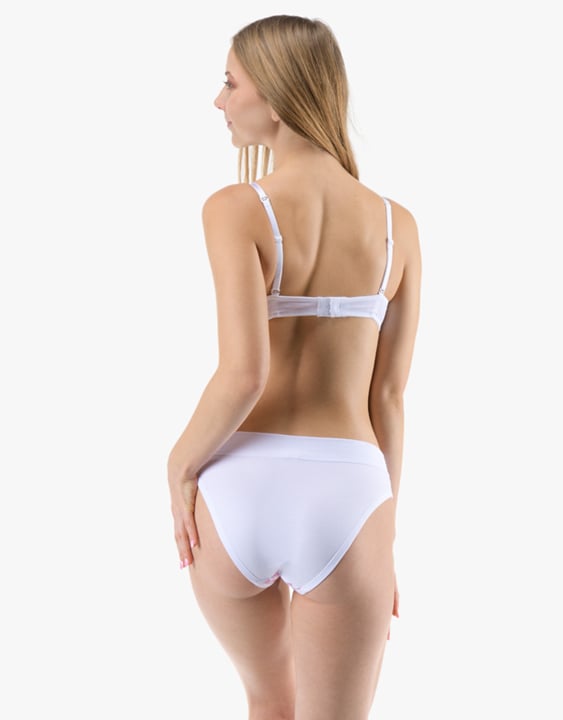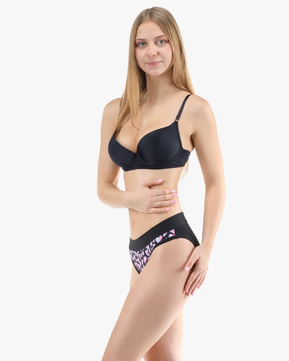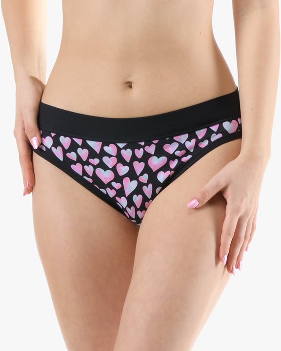 Dámské klasické kalhotky s úzkým bokem GINA 10296P jsou dámské šité kalhotky klasického střihu s úzkým bokem a širším pasovým lemem. Pasový kraj je začištěný širším lemem ze stejného materiálu. Nohavičky jsou začištěné úzkým lemem ze stejného materiálu. Přední díl je potištěný. Zadní díl a lemy jsou jednobarevné.