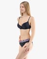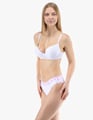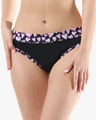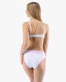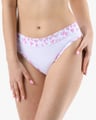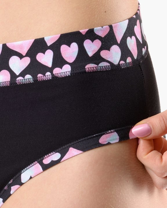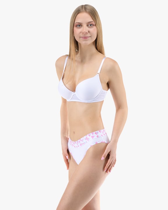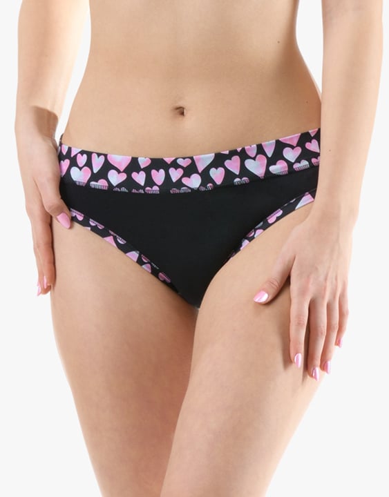 Dámské klasické kalhotky s úzkým bokem GINA 10297P jsou dámské šité kalhotky klasického střihu s úzkým bokem a širším pasovým lemem. Pasový kraj je začištěný širším lemem ze stejného materiálu. Nohavičky jsou začištěné úzkým lemem ze stejného materiálu. Přední díl je jednobarevný, lemy v pase a v nohavičkách jsou potištěné.