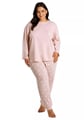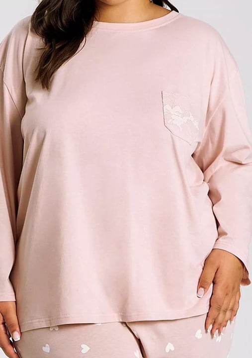 Dámské nadměrné pyžamo Nori 3468 značky TARO přináší spojení elegance a pohodlí, které si zaslouží každá žena. Tento dvoudílný set v jemném pastelově růžovém odstínu je navržen pro chvíle klidu i odpočinku. Vrchní díl s dlouhými rukávy a kulatým výstřihem nabízí uvolněný střih a decentní krajkový detail, který podtrhuje ženskost. Praktická kapsička na hrudi dodává pyžamu ležérní nádech. Spodní díl tvoří dlouhé kalhoty s elastickým pasem a hravým vzorem bílých srdíček, díky kterému se budete cítit příjemně a stylově zároveň. Materiál z čisté bavlny je lehký, prodyšný a šetrný k pokožce – ideální volba pro každodenní nošení doma i na spaní.