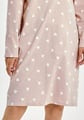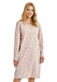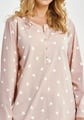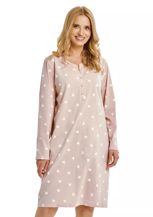 Dámské noční košile Nori 3443 značky TARO přináší do Vašeho večerního rituálu lehkost a pohodlí, které si zasloužíte. Jemný pastelově růžový odstín s hravým vzorem drobných bílých srdcí působí elegantně a zároveň útulně. Střih je volný, sahající ke kolenům, což umožňuje volnost pohybu i maximální komfort při spánku nebo odpočinku doma. Dlouhé rukávy zakončené manžetami spolu s véčkovým výstřihem na knoflíky podtrhují rafinovanou jednoduchost tohoto kousku. Materiál tvoří kvalitní 100% bavlna, která je příjemná na dotek, prodyšná a vhodná pro každodenní nošení.