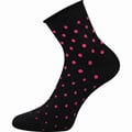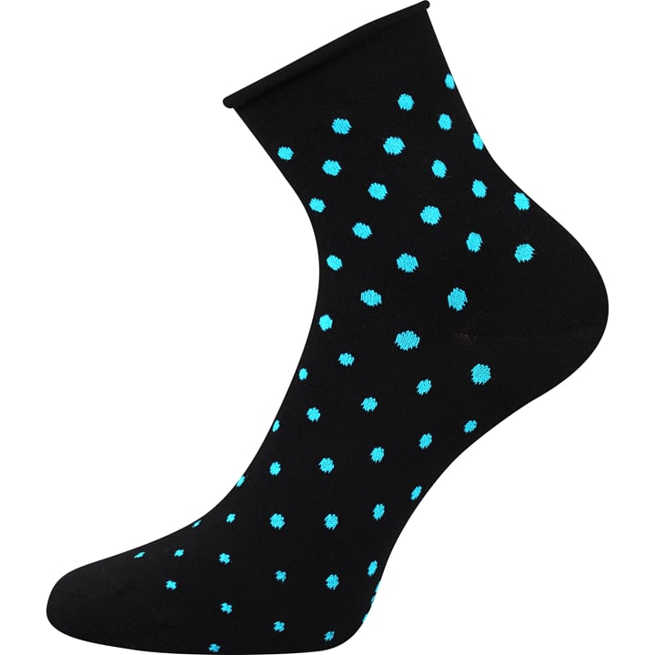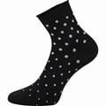 Dámské ponožky Lonka FLAGRAN jsou dámské letní ponožky, které vás okouzlí veselými barevnými puntíky, které se od prstů postupně zvětšují. Elegantní a jednoduché ponožky v mixu černé nebo bílé barvy doplňuje rolovací lem. Tento lem je nestahující a nohy neškrtí. Kvalitní slabé ponožky mají pro maximální pohodlí při nošení špičku spojenou plochým řetízkováním, které netlačí a nezpůsobuje puchýře ani otlaky. Upletené jsou na 200 jehlových strojích, proto jsou velmi jemné. Bavlněné ponožky jsou vhodné pro běžné nošení na doma i v práci. Střední výška ponožky je ke kotníku, ideální na nošení v létě.