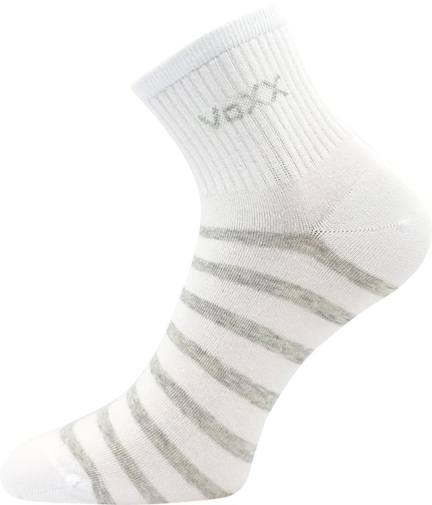 Dámské ponožky VoXX BOXANA jsou ponožky ideální na letní nenáročné fitness aktivity i celodenní nošení. Výška těsně nad kotník je velmi pohodlná. Žebrovaný lem je jemný a na noze nepříjemně neškrtí. Slabé ponožky mají vyšší podíl bavlny, jemné k pokožce a příjemnější na nošení. Špice je uzavřena náročnějším řetízkováním, díky kterému je spoj dokonale hladký a nehrozí, že ponožka bude tlačit. Díky jemným proužkům bude Váš den hned veselejší! Vhodné do rozmezí teplot od 10°C do +35°C, ponožky jsou v teplotní třídě A.