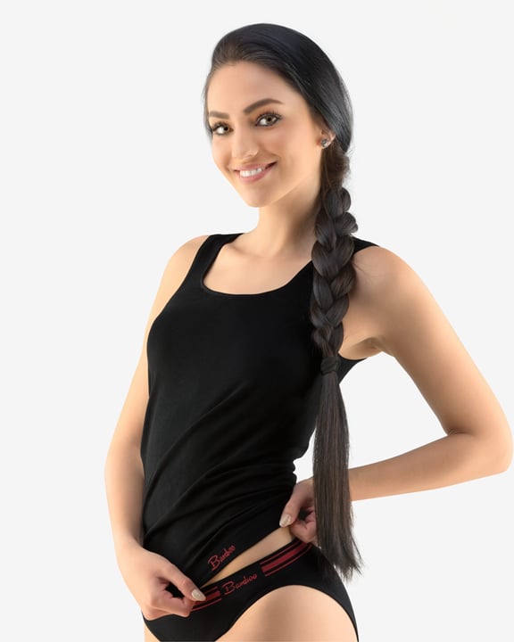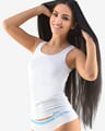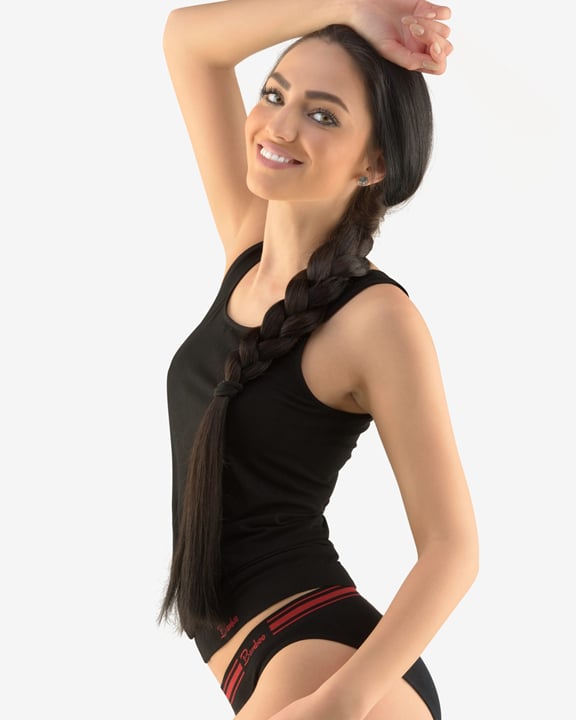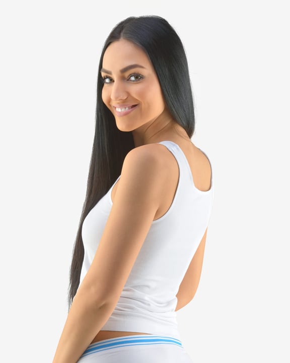 GINA Natural Bamboo 08028 je tílko se širšími ramínky, dámské bezešvé prádlo. Dolní kraj je zapravený bezešvým způsobem. V průramcích a průkrčníku je zašitá úzká pruženka. Ramínka se na předním díle mírně zužují, čímž se vytváří pěkně tvarovaný dekolt. Tílko je jednobarevné. V záložce je vypletené barevné logo. Tílko je v prodloužené délce.