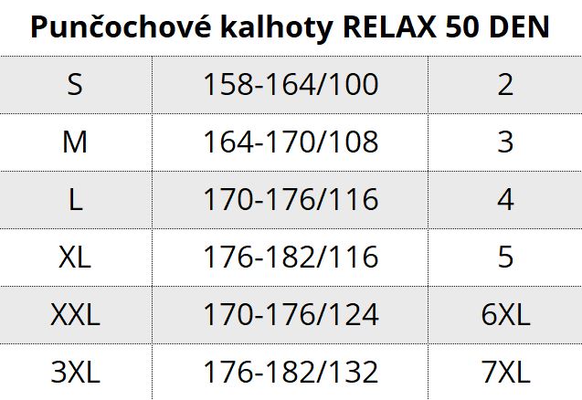 Dámské punčochové kalhoty RELAX tights 50 DEN jsou dámské podpůrné punčochové kalhoty, díky speciálně zapletenému elastanu vhodné na prevenci vzniku křečových žil a pocitům tzv. těžkých nohou. Mírná komprese působí pozitivně na krevní oběh díky slabému stupňovitému masážnímu tlaku. Punčocháče jsou bez zesílené špice a paty, nosit se dají i v otevřené obuvi. Pro maximální pohodlí mají zesílený sed s decentním malým bavlněným klínkem, od velikosti XXL je klín velký. Komfortní punčocháče jsou balené v extra sáčku v obálce a navíc jsou příjemně parfemované.
