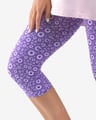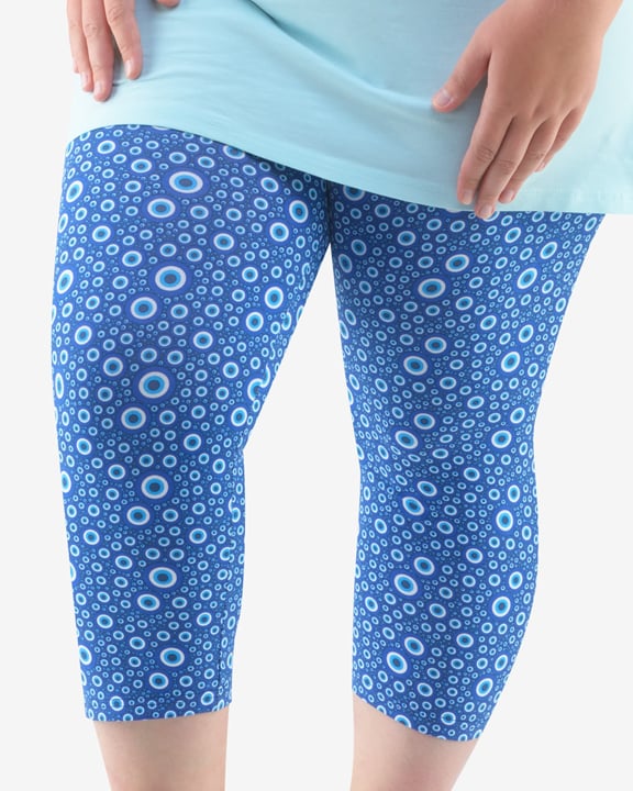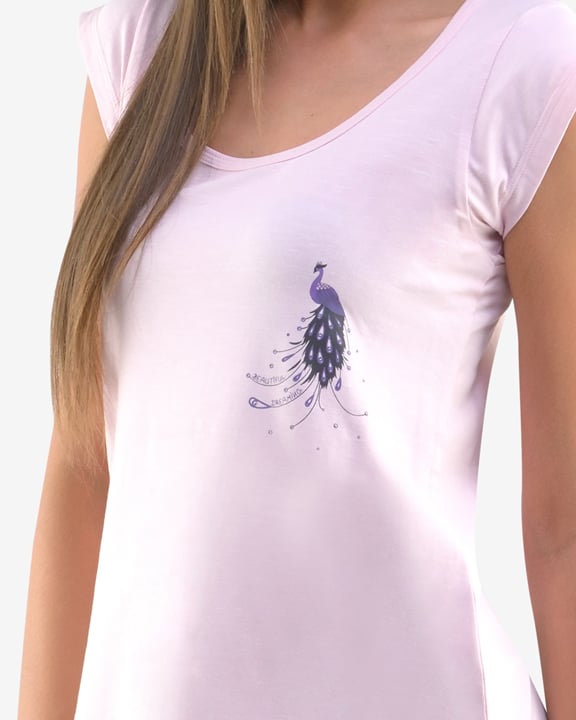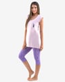 Dámské pyžamo GINA 19104P má triko do střihu "A" s krátkým rukávem a 3/4 legíny. Kalhoty jsou potištěné. Triko je jednobarevné s malým solitérem.