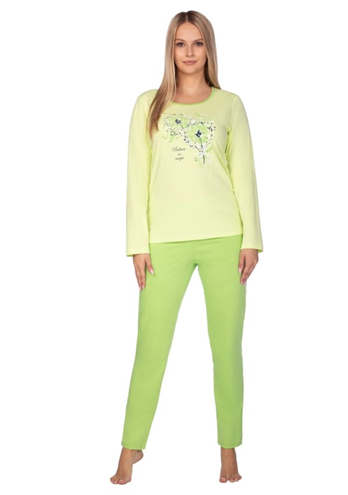 Dámské pyžamo s dlouhým rukávem a dlouhými kalhotami 647/33 Regina. Tričko je s obrázkem květin a nápisem ´Believe in magic´. Jednobarevné kalhoty jsou šité bez kapes a mají volnou gumu v pase. Pyžamo je ušité z kvalitní měkké bavlny, která poskytuje maximální komfort při nošení.