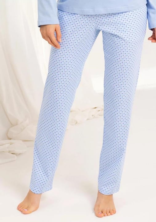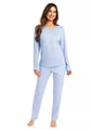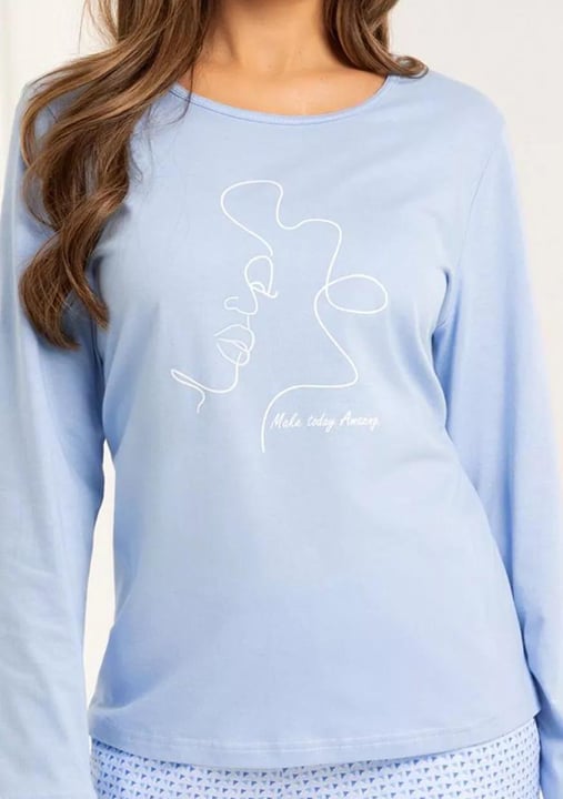 Dámské pyžamo 704/51 značky REGINA přináší do Vašeho domova svěží eleganci a pohodlí. Horní díl v jemné světle modré barvě zdobí hravý potisk, který rozjasní každý večer i ráno. Dlouhé rukávy a volnější střih zajišťují maximální komfort při odpočinku nebo spánku. Kalhoty ve stejném odstínu jsou oživené decentním vzorem, jejich rovný střih a pružný pas podporují pocit lehkosti po celý den i noc.