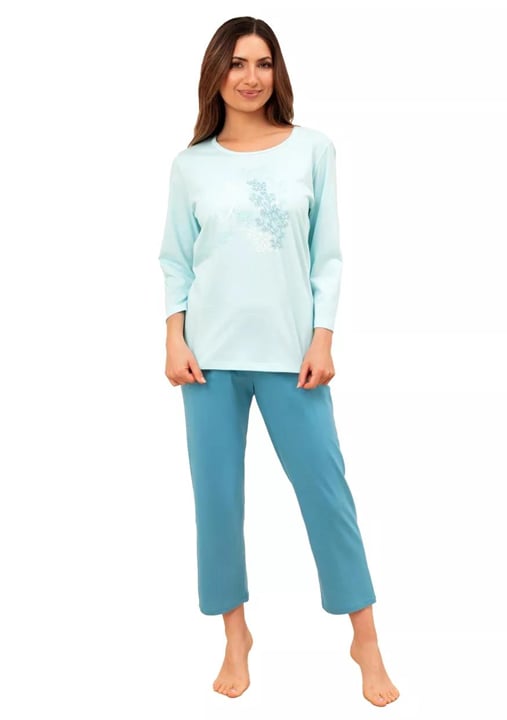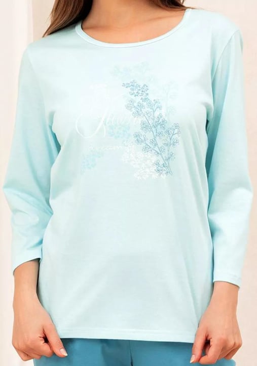 Dámské pyžamo 706/53 značky REGINA přináší harmonii elegance a pohodlí do Vašeho každodenního odpočinku. Horní díl v jemném světle modrém odstínu zdobí decentní květinový motiv, který působí svěže a žensky, aniž by narušoval čistotu designu. Dlouhé rukávy s mírným zúžením u zápěstí chrání před chladem a kulatý výstřih zajistí volnost i příjemný pocit při nošení. Spodní díl v tmavším tónu modré ladně doplňuje celý komplet – rovné nohavice se lehce zužují ke kotníkům, což podporuje volnost pohybu i během spánku.