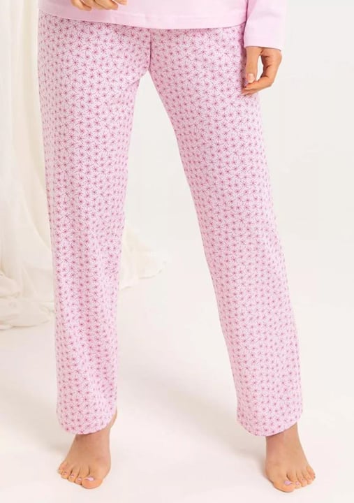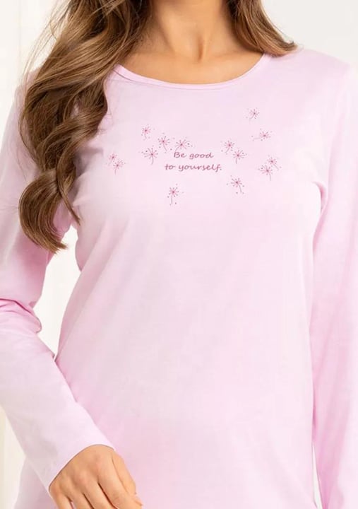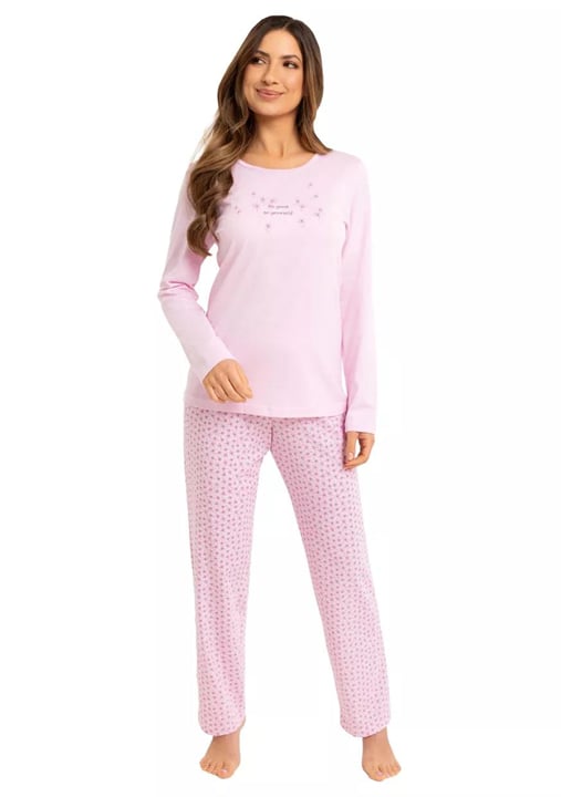 Dámské pyžamo 708/52 značky REGINA přináší do Vašeho večerního rituálu pocit lehkosti a pohodlí. Jemný pastelově růžový odstín v kombinaci s dlouhými rukávy a kulatým výstřihem působí elegantně, zatímco hravé motivy na tričku i kalhotách dodávají celku špetku radosti. Volnější střih horního dílu spolu s rovnými nohavicemi zajišťuje volnost pohybu během spánku i odpočinku doma. Elastický pas kalhot se postará o příjemné nošení bez nepříjemného stahování.