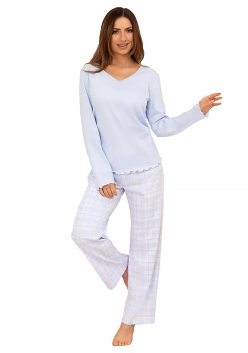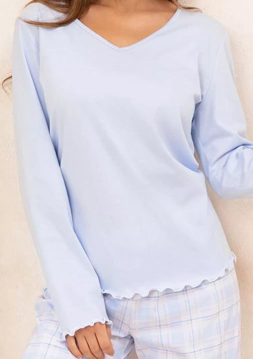 Dámské pyžamo 712/52 značky REGINA přináší elegantní spojení pohodlí a stylu, které ocení každá žena. Horní díl v jemné světle modré barvě s dlouhými rukávy a výstřihem do V působí lehce a vzdušně, zatímco decentní vlnkované zakončení dodává celku ženský nádech. Spodní díl tvoří široké kalhoty s klasickým kostkovaným vzorem ve světlých odstínech modré a bílé, což zajišťuje nejen atraktivní vzhled, ale i maximální volnost pohybu při odpočinku nebo spánku.