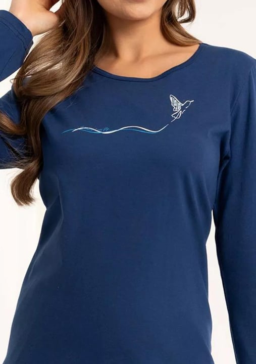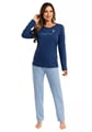 Dámské pyžamo 714/51 značky REGINA přináší spojení elegantního vzhledu a maximálního pohodlí, které si zamilujete každý večer. Horní díl v hluboké námořnické modři s jemným obrázkovým motivem na hrudi působí decentně a stylově. Kulatý výstřih a dlouhé rukávy vytvářejí příjemný pocit lehkosti i během chladnějších nocí. Spodní díl v kontrastní světle modré barvě s drobným kostkovaným vzorem dodává celku svěží nádech a uvolněný charakter. Díky volnému střihu a elastickému pasu kalhot se můžete těšit na ničím nerušený spánek i relaxaci doma. Pyžamo je vyrobeno ze 100% bavlny, která je prodyšná, měkká a šetrná k pokožce.