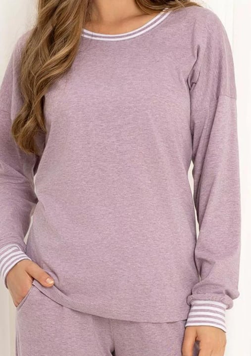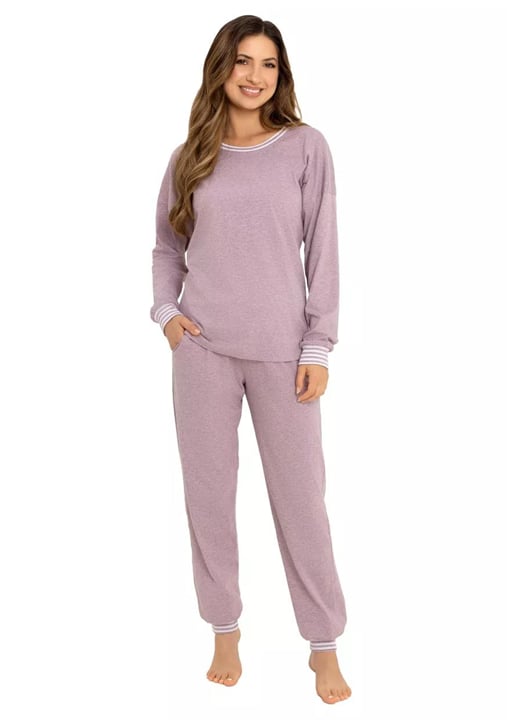 Dámské pyžamo 718/52 značky REGINA přináší spojení elegance a pohodlí, které ocení každá žena hledající kvalitní domácí oblečení. Jemný levandulový odstín v kombinaci s decentním vzorem proužku na výstřihu a manžetách působí velmi vkusně a podtrhuje celkový dojem lehkosti. Vrchní díl má příjemně volný střih s kulatým výstřihem zvýrazněným kontrastním lemem, zatímco dlouhé rukávy i nohavice jsou zakončeny žebrovanými manžetami pro větší komfort při nošení. Praktické kapsy na kalhotách zvyšují užitnou hodnotu tohoto modelu.